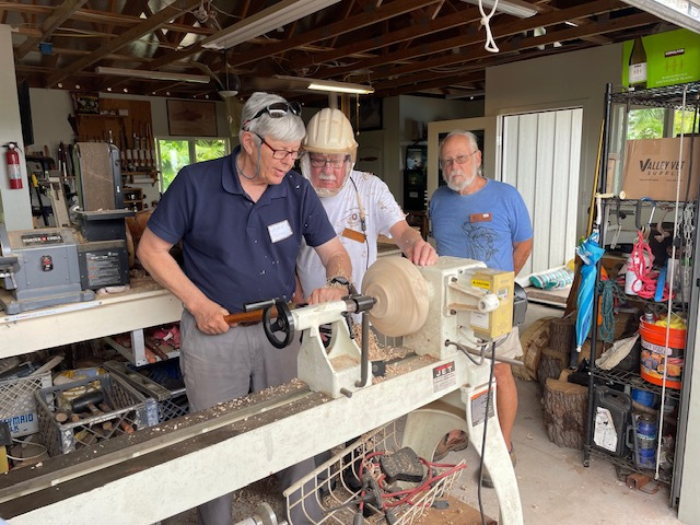 Club guest testing tool control and technique using a bowl gouge as club members Kelly Dunn and Ken Obenski look on.